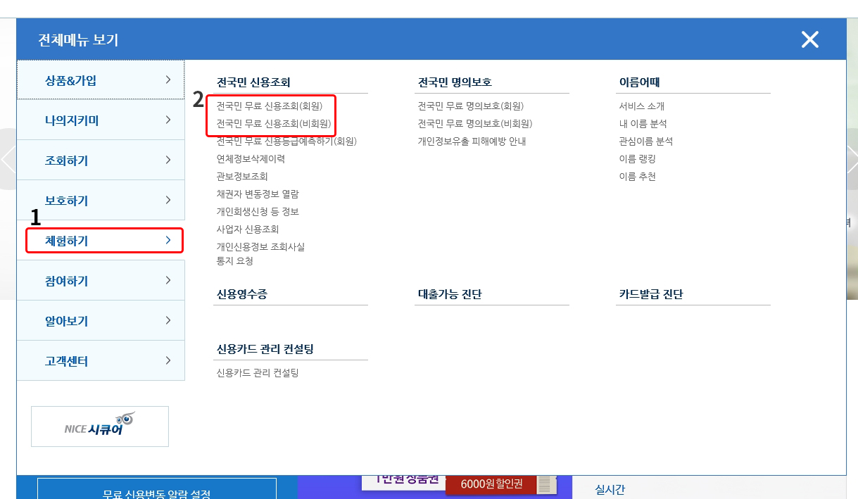 클릭하시면 전체 메뉴 보기가 뜹니다. 맨 왼쪽 세로메뉴 5번째 1번 빨간색으로 표시한 체험하기 클릭 하시면 오른쪽 전국민 신용조회 2번 빨간색 부분에 비회원, 회원 선택 클릭하시고 진행 하시면 무료 신용조회를 하실 수 있습니다.