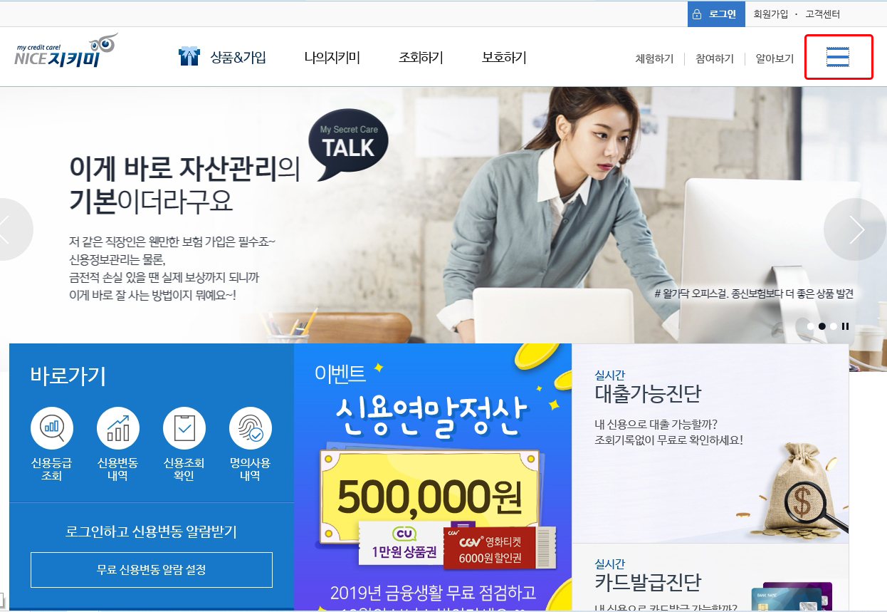 사이트 검색 접속을 하시면 메인화면에 상단 메뉴 맨 오른쪽 빨간 부문표시 한 부분 파란색 햄버거버튼을 클릭하세요.